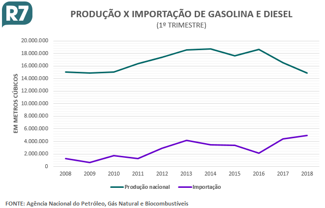 O Brasil nunca comprou tanta gasolina e diesel de outros países como nos últimos dois anos. Em 2017, a alta das importações foi de 61%, na comparação com o ano anterior. No mesmo período, a produção nacional caiu 7%.